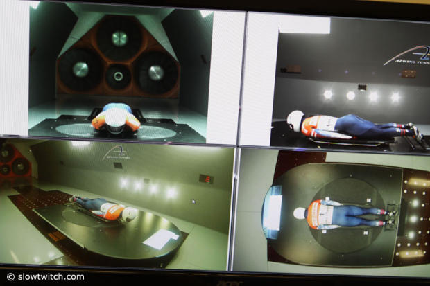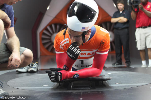Testing in the tunnel was done at 60mph, 70mph and 80 mph and their drag numbers were very low. Matt Antoine at 6'2" and 185 pounds has a very good physique for this sport and his numbers were quite impressive. Translated to typical cycling 30mph test speeds he only has about 80 watts of drag.