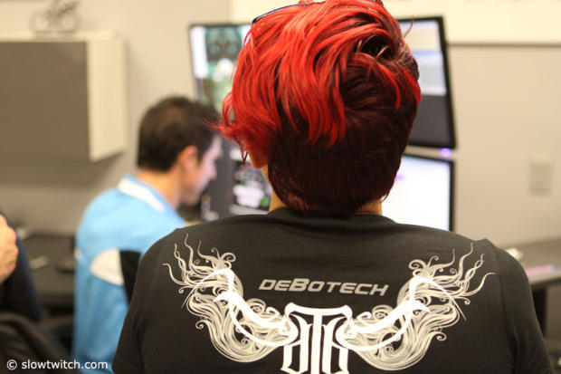 Katie Uhlaender looks at the control panel as Kyle Tress does his thing in the tunnel.