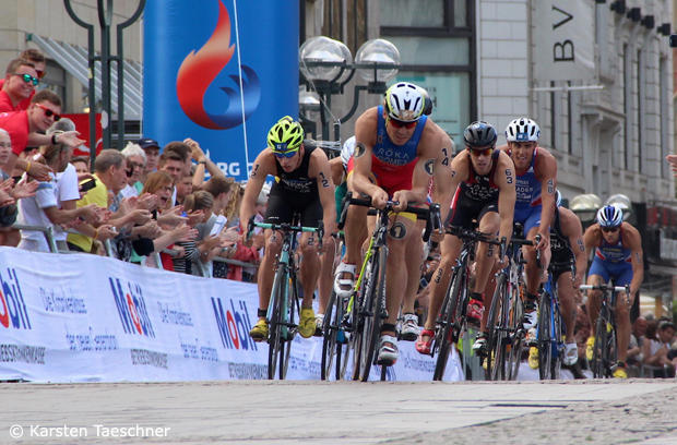 After one lap of the bike leg, Gomez led a lead group of 11, 26 seconds ahead of a large chase group that included Mola and Murray, who suffered a 10-seconds penalty for bad housekeeping – a water bottle out of his basket – in T1. By the second lap, Luis led a 9-man pack that included Pujades, Dorian Coninx of France, Zaferes, Henri Schoeman of South Africa, Gomez, Justus Nieschlag of Germany, Aaron Royle of Australia, and Varga. Led by Mola and Murray, the chase pack stood 30 seconds down.