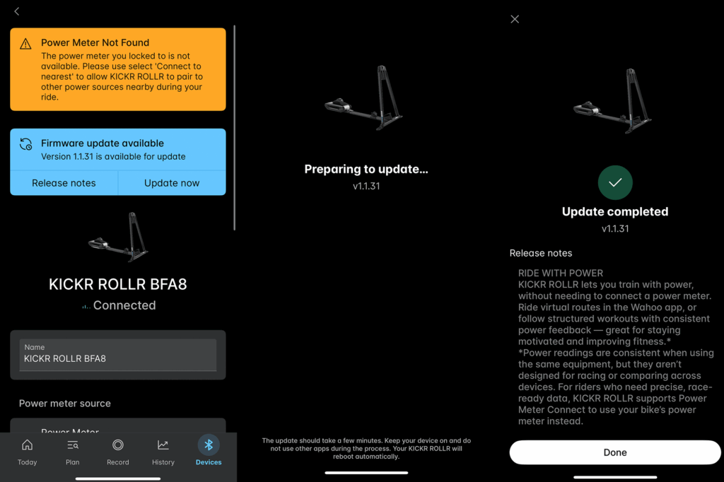 Find your KICKR ROLLR in your devices tab on the lower right. Once connected , update it to Firmware 1.1.31. This took me about 45 seconds to update – the speed for you will depend on your internet connection.