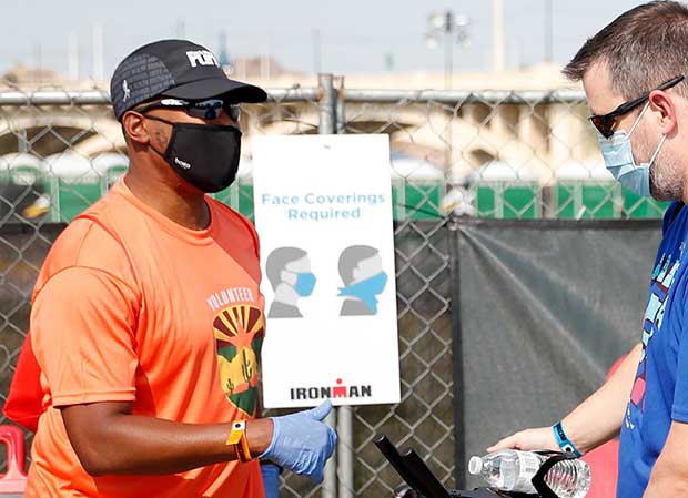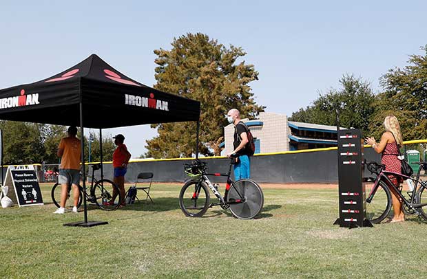 “All participants received an e-mail from Active.com where you selected a one hour window on Saturday to bring down your bike and do registration. My wife and I selected 9-10am, the second hour time slot available (they began at 8am). As we approached Tempe Beach Park and the Athlete Village, we could immediately see there was control over the flow of pedestrian traffic with staff at the various entrances, with hand sanitizer and enforcing the mask requirement to enter.