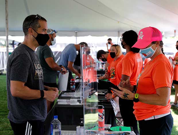 “We were directed to the separate Athlete Check in area. Again, they had some tables set up under a tent where they did the initial check in of scanning your registration code and checking your driver’s license. The volunteers were behind a 2-foot high wall of plexiglass since they couldn't practically be 6-feet away while doing this. We were given a pen to use that also had a rubber ball on one end to be able to hands-free tap on an iPad device screen. I thought that was a nice touch.