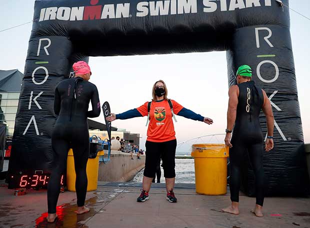 “As we approached the swim start are, there were volunteers with signage for swim pace corrals. for all swimmers under 35 minutes, they simply lined us up in two rows 6 feet apart, everyone in masks. Paul Huddle was stalking up and down the rows reminding people to keep their masks in place. Once the cannon sounded, two swimmers were staged to start, one would go and 5 seconds later the other. I arrived a tad late to the area and was a good 50 feet from the ramp but it only took about 5min to start. I was so preoccupied I did forget to take off my mask when told to go and had to literally rip it from my face.