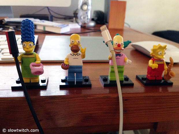If you have kids, you likely have Legos in your home and if you are not yet married or with kids, chances are that your mother still has some of your old Legos. Plus if none of those situations apply, they are simply not that difficult to get. Lego figures can really serve you well with all those charging cables that you likely have floating around your home, as their little hands seem to be the perfect diameter to hold them. I personally hate it when my cable constantly slides down from my desk when the unit that is supposed to get charged isn't attached. But in my case, the Simpsons are awesome assistants, in this case holding my iPhone and my Pebble charger. The selection of Star Wars figures is also quite impressive and would appear to be a great theme.
