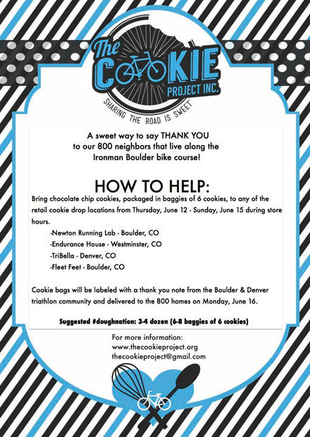 People who live along a race course aren't always passionate about the spectacle that is about to befall them. And that is even more so true for the nuisances and inconveniences that something accompany big events. To reach out to the 800 neighbors who live along the Boulder Ironman course, the Cookie Project will deliver a bag of cookies to each of these families, as a peace offering of sorts. From Thursday June 12th through Sunday June 15th, four locations in Boulder will accept cookie donations, in bags of 6. But the more bags of 6 are delivered the better it is. Accepting these cookies are Newton Running Lab in Boulder, Endurance House in Westminster, TriBella in Denver and Fleet Feet in Boulder. They will be labeled with a thank you note from the Boulder & Denver triathlon community and then delivered on June 16th. This is a wonderful idea that started in Madison, Wisconsin in 2013 and looks to be embraced by other communities now. Initially though this was not connected to a race, but a girl who shared cookies with folks who lived along a route she cycled past on a daily basis. A link to the site is above in the intro.