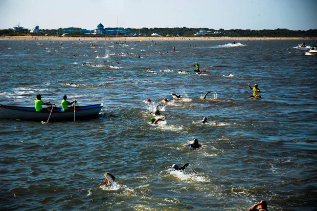 Boats and surfboards are lined up so swimmer have a channel of sorts that guides them to the shore. And man, that distance does seem far.