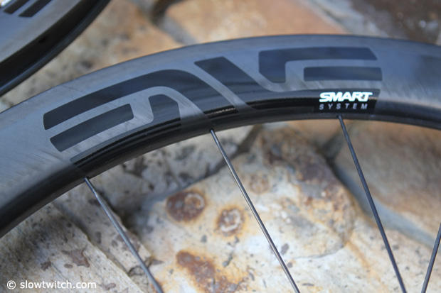 Enve introduced new SES 5/6 650c wheels at the 2014 Summer Press Camp and that should make all those folks happy who ride 650c bikes and may feel a little left out when it comes to wheel options for their bike. The Enve crew told us that this is also a new rim depth option, and that they did not just recycle another rim size for this offering. These wheels are 48mm deep in the front and 56mm in the back. But just like the other Enve SES wheels, these 650 ones are wider in the front (27mm) than in the back (25mm).