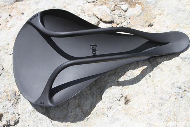 The view from below shows the unique construction of this Fabric Alm saddle. The similar shaped printed titanium one would have been heavier and more than twice as expensive.