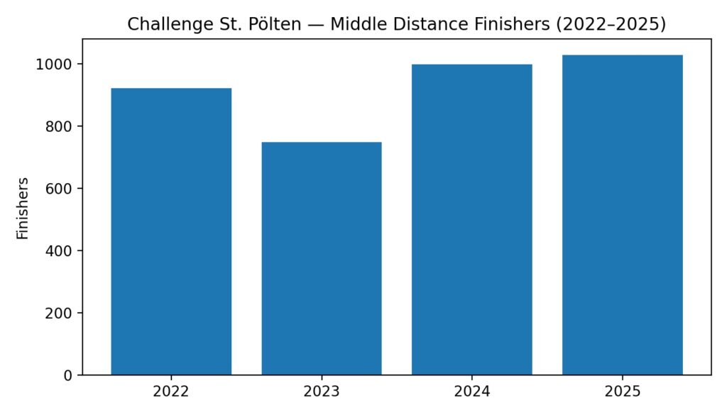Although there wasn’t any racing in 2020, before the COVID Pandemic hit cancelling all events, IRONMAN had scheduled a 70.3 event in Graz the same weekend as Challenge St. Pölten, signalling that the corporation wasn’t going to make things easy for the new Challenge Family event. Once racing did return in 2022, the race never got back to its glory days of entries, which had topped off at over 2,000 finishers of the 70.3 race and about 3,500 athletes competing in all the various events during the weekend. There were under 1,000 finishers in 2022, and in 2025 there were 1,029 athletes who completed the event.