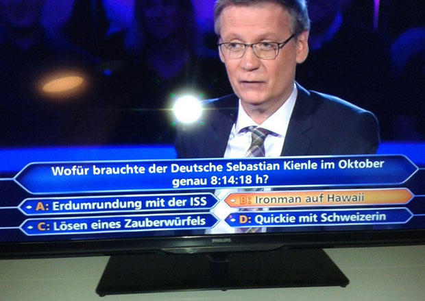 The 2014 GoPro Ironman World Champion Sebastian Kienle of course made the German news and was featured on various sport shows on German TV, but he recently also was featured on a German quiz show. Not he in person, but his name and time had to be connected with the correct response. Someone from the Sebastian Kienle Fanclub on Facebook snagged this little gem, and the D response seems to be the funniest one. Our publisher Dan Empfield was featured a similar way on the American quiz show Jeopardy a few years back, but the alternatives answers were nowhere close as funny. A big thanks to Andres from Beyond Aero for the tip.