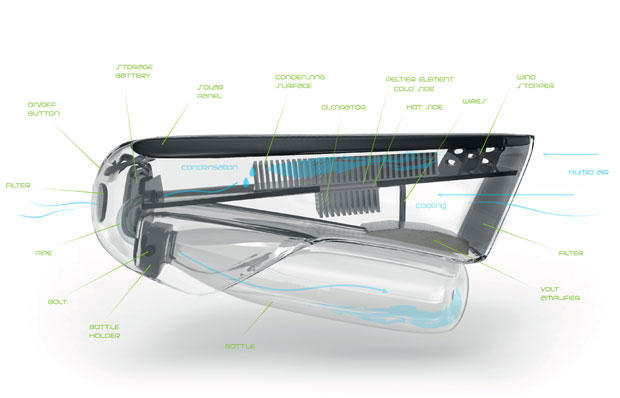 How nice would it be if you could just ride along and not have to stop for water because your water on board gets refilled as you go? That is the premise of the Fontus self filling water bottle system of Austrian designer Kristóf Retezár. It collects humid air, condenses it and then stores it as safe drinking water. The thought currently is that in humid conditions Fontus could pull about .5 liters of water out of the air in about an hour, so that would make it not so practical or interesting for racing. But as we all know, the world does not evolve around racing. Just imagine riding your bike in areas where finding clean drinking water is not so simple, and that is actually an issue for a large percentage of the earth's population. According to Retezár by 2030 almost 47% of the world population will be living in areas where water access will be an issue. So we all need to think more along those lines. This is a very smart idea and hopefully something that will move forward. It is currently in the running for a James Dyson award.
