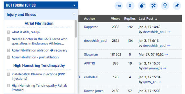 You’ll find HOT FORUM TOPICS in a couple of places on the forum, near the top, hard to miss. If you click that blue bar it’s a drop down menu. As of this writing there is one category: Injury and Illness. Below this are several sub-categories: Atrial Fibrillation; High Hamstring Tendinopathy; Mad Calf Disease; Iliac Arterial Endofibrosis; and so forth. Underneath each of these sub-categories sits a list of the most important discussions on these topics. As time permits we will expand these to cover training, racing, selecting and working on equipment. We'll keep going until we've built it out, then adding and subtracting threads to keep this relevant and useful.