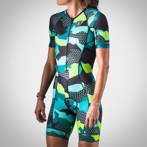 People who watched the IRONMAN World Championships likely noticed the unique camouflage kits of Josh Amberger and Heather Jackson. Amberger who was first out of the water had plenty of airtime on that day in front of a worldwide audience. Jackson who battled hard with This speed suit is made by Wattie Ink in California and it is called Urban Assault.