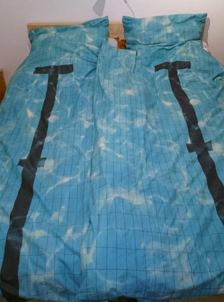 We all have an image in mind when we hear the word pool set, but it likely is not the one Sebastian Kienle recently tweeted about. When you go to bed with these sheets you will likely dream about the black lines too, and possible do a few backstrokes while you are sleeping. We are not sure who makes those sheets, but it is clearly a Euro thing. Otherwise there would not be two covers on such a tiny bed.