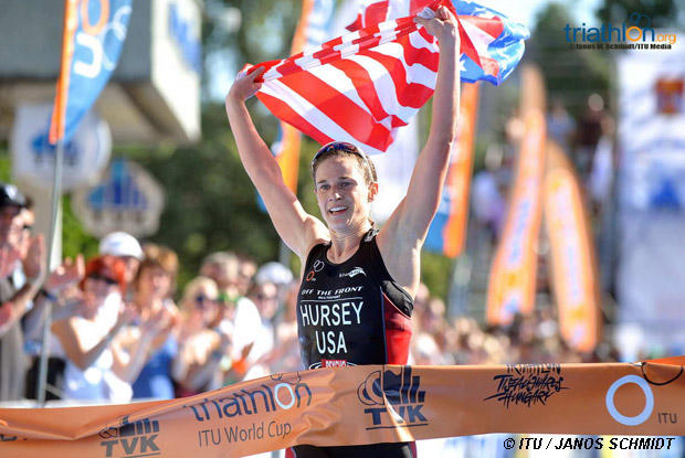 Rising U.S. star Katie Hursey won her second straight International Triathlon Union World Cup and young Swiss Florin Salvisberg won his first such title at the Tiszaujvaros World Cup sprint final Sunday.