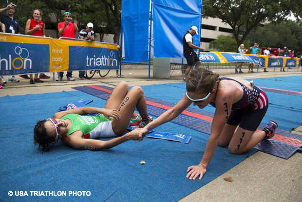 After a lead pack of nearly two dozen cyclists arrived in T2 together, Grajales broke away to the men’s win with a race-best 32:29 run that brought him to the finish in 1:47:09 with a 34 seconds margin of victory over runner-up Diogo Sclebin of Brazil and 44 seconds over 3rd-place finisher Irving Perez of Mexico.