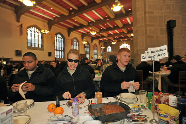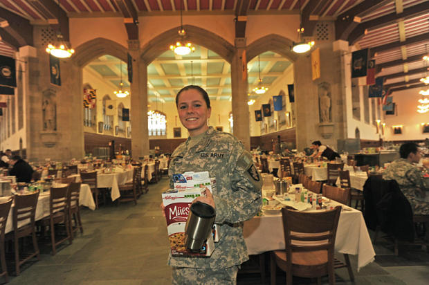 Like many hungry varsity athletes, Cadet Randy Wintermantel snags serious quantities of mess hall product to tide her through a typical 14-hour, 5,500 calorie day.