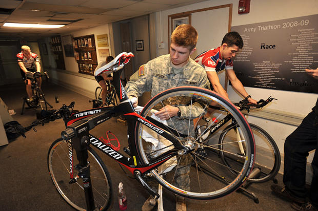 Cadet Andrew Stock tunes up his Specialized bike before starting an afternoon indoor bike workout at the Triathlon club storage room.