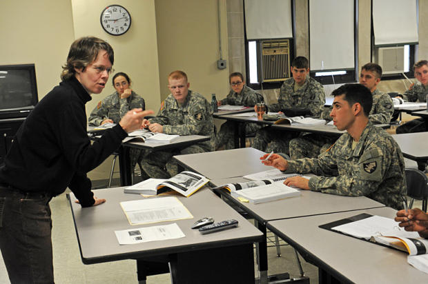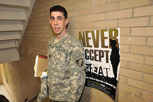 In between classes, Vandam stops by a typically rah-rah Never Accept Defeat sign which has a darker subtext for stressed out cadets: It advertises a suicide prevention center.