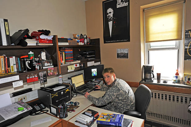 Cadet Ryan Peacock, a triathlon team member, has a study console with all the digital tools available. His roommate has posters of Pre, Ali, the Beatles, Batman and Obama above a neatly made bed.