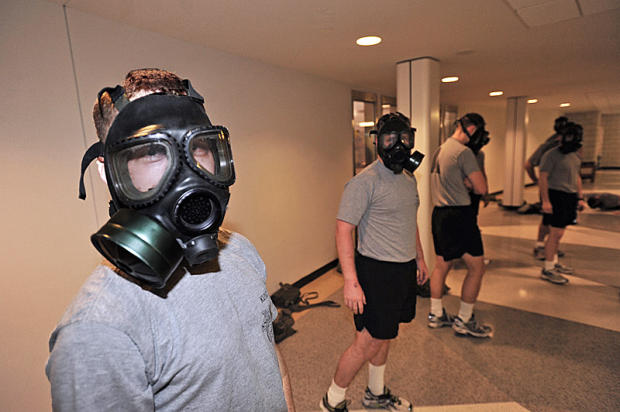 The military purpose of the Academy is always part of the lives of cadets. Next door to the pool, a squad of cadets does a physical fitness training workout wearing gas masks.