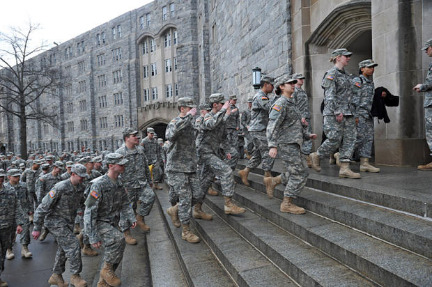 Cadets march double time to classes, but must salute any passing officers and often offer a “Beat Navy!” greeting.