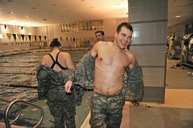 While the triathlon team pushes through a hard workout in Speedos, other cadets maintain Army water survival standards with a 6:00 AM full uniform dunking.