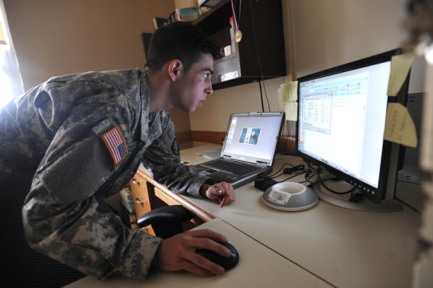 Triathlon team captain Nick Vandam checks in for messages on West Point’s well-wired Internet setup in his barracks quarters. On a typical day, Vandam checks in with Coach DeBoom and relays adjusted workout schedules to team members.