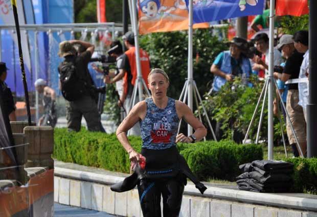 Among long distance age group competitors, the undisputed star of the Canadian team to China was Tamasin Reno. She would go on to record the fastest time of all age group athletes in Weihai on her way to winning the women's 30-34 age group. She is, however, a notoriously average swimmer compared to her formidable land-based skills. She would exit the swim more than 4 minutes behind Ms. Miller, using time stamps as an unofficial "timing system."