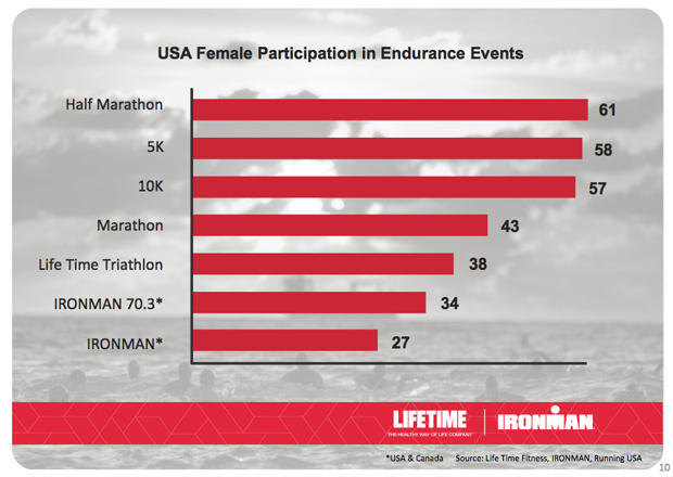 Still, 32 percent is a low number when you consider that half-marathon registrants in the U.S. are something like 60 percent female. Life Time and Ironman see women as the lowest of the low-hanging fruit and I agree. Women overwhelmingly just want to be asked to participate. If you ask, and present a rational and safe pathway to participation, they'll say yes.