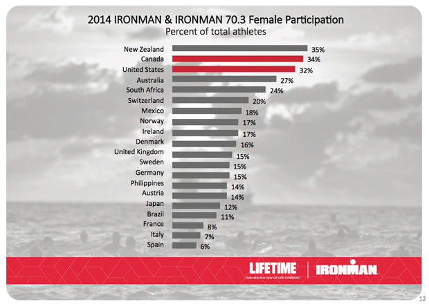 America is way ahead of the rest of the world in female participation in endurance sports and you can see it in Ironman's own stats. Only in Canada and New Zealand are there more female customers, on a percentage basis, than in the U.S. While it might seem that 32 percent female is a low number (that's the customer breakout for Ironman in the U.S.) it's in the 20s, teens or single digits everywhere else in the world excepting Canada and NZ.