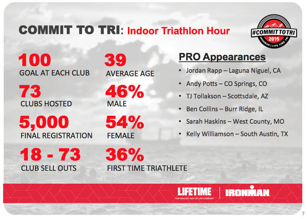 Ironman. What's it getting? Access to close to 2 million club and non-access members who are regularly exhorted and urged to do a triathlon, if even a very short, in-club triathlon (everybody starts somewhere). Bear in mind the indoor tris are co-branded and there is at least one Kona slot devoted to this program! (More on the indoor triathlons below.)