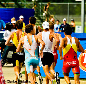 With 100 meters to go, Simon Whitfield, Brad Kahlefeldt, Jan Frodeno and Kris Gemmell had separated themselves from Jarrod Shoemaker and Javier Gomez, a record setting world champion who is not a renowned finish line sprinter.