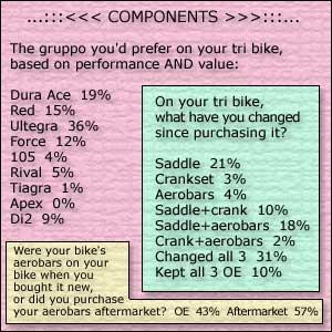 You aren't satisfied with riding your tri bikes as they come originally equipped. Almost 6 in 10 of you have swapped out your aerobars. Only 1 in 10 of you has not changed your saddle, crankset or aerobars from their OE spec.