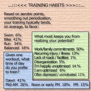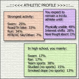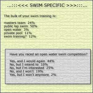 Seventeen percent of you swam in high school, and only 25 percent of you consider swimming your current strength. Yet, only 6 percent of you swim more (in aerobic equivalence) than you bike and run, and only another 18 percent of you swim in a fashion equal to your bike and run. We didn't poll this, but it's my guess that the 25 of you who consider swimming your strength corresponds to the 25 percent of you who swim equal to or more than you bike or run. In other words, those of you who swim poorly are destined to continue to swim poorly, unless something in your routine changes!