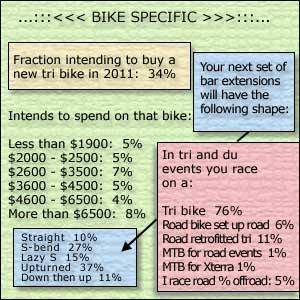 About a third of you intend to buy a new bike this year. Of those of you who'll buy a new tri bike, 25% of you will spend $6500 or more. Half of you who're buying a new tri bike will spend at least $3600. Three-fourths of you will do all your racing on a tri-specific bike.