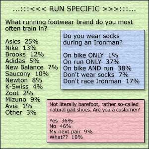 Notwithstanding the fact that these two companies represent $30 billion in annual sales, you're only moderately impressed with Nike and Adidas technical running footwear. They poll 13 and 5 percent respectively. Surprisingly (to me) New Balance doesn't seem to strike your fancy either (7%). Dominant is Asics (25%), and Chrissie Wellington-wearing Brooks sits at 12%. Saucony and Mizuno are hanging in there, and upstart Newton has carved out a market.