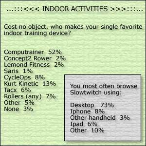 You guys love your Computrainers. More than half of you think this is your favorite indoor training device. But this poll was taken before the Lemond Revolution was introduced, and, that device might poll better than it did were we to retake the poll (which we will in the future).