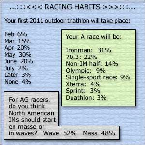 Only 4 percent of you, for example, intend not to race a triathlon in 2011. About a third of you are pointing toward an Ironman race as your A race this year. Two-thirds of you selected as your A race an event that's at least 70.3 in length.
