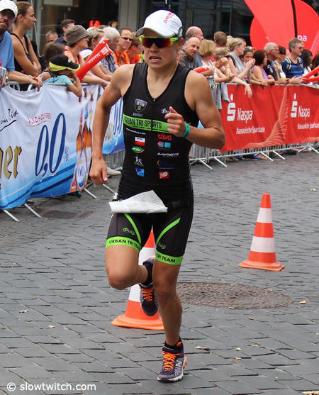 Boris Stein flying along during the run with a solid lead. He ran 1:16:51 to close out his day.