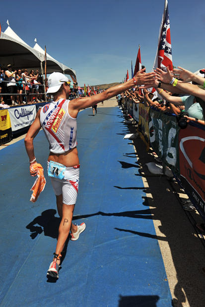 Desiree Ficker rode a 4th-best 2:38:18 but her race-best 1:24:47 run vaulted her to 2nd place.