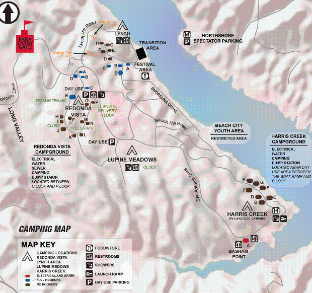 Lynch is down near the water's level (well, where the water usually is). Redondo Vista is the camping area up on the plateau. The value in Redondo Vista is it's easier to get in and out of the area from this spot, and you aren't in the middle of everything. The downside to Redondo Vista is that you're farther away from everything, so, it's a pretty good hike to the food vendors, transition area, start/finish and expo area. Just depends what you value. Redondo Vista also has hookups. If I was staying at Redondo Vista I'd try to be in A or B, because there's a shortcut trail down through Lynch to race center. It's the closest spot on the plateau both to the park entrance and to all the festivities.