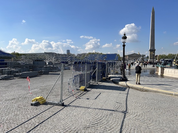 The majority of temporary stadium construction is taking place around the city center, including a 30,000 person venue at Place de la Concorde, a 12,000 seat stadium near the Eiffel Tower, and an 8,000 person venue at Les Invalides.