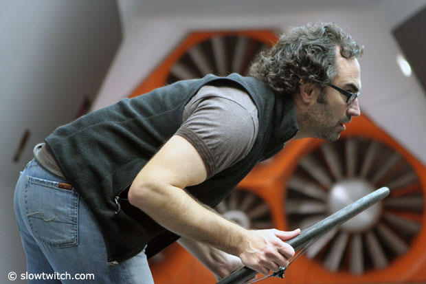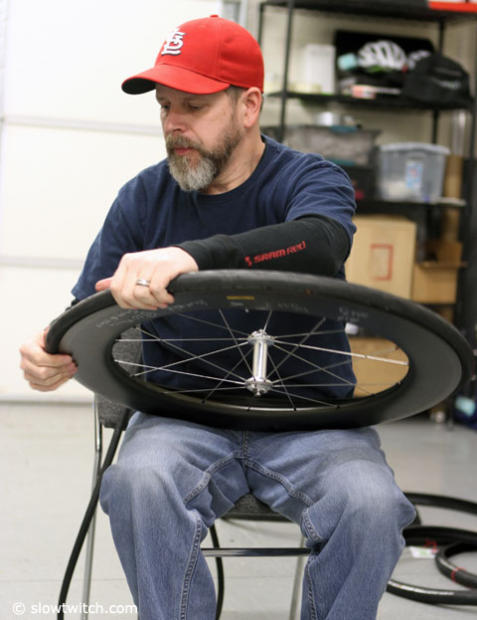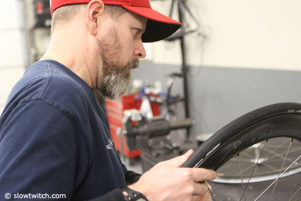 Master Wheelbuilder Nic James gets a wheel ready for the wind tunnel.