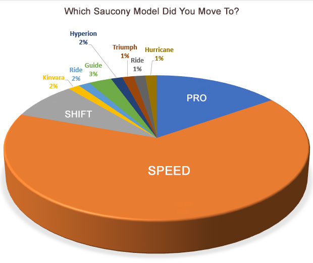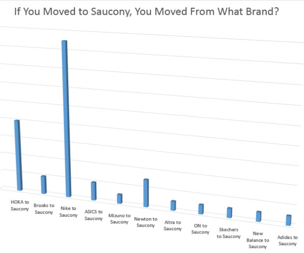 But Saucony! This brand was the big gainer. Saucony moved in a short span of time from 12 percent to 19 percent among the 1300-plus Slowtwitchers who took our two polls. While I knew that the Endorphin line was something special, I didn’t expect Saucony to increase its user preference margin by north of 50 percent in only a year. I asked on our Reader Forum a number of questions. If you switched to Saucony, what brand did you switch from? And what model of Saucony did you switch to? Below is what I've learned so far, and with about 70 of reporting on their move from *something* to Saucony I think we have enough to spill from anecdotes over and into the beginnings of relevancy.