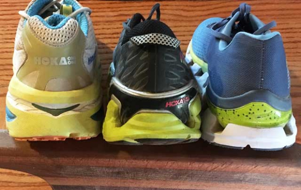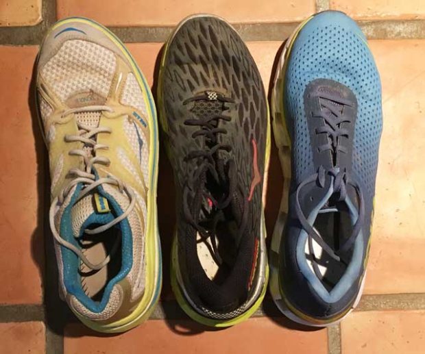 Here are the same three shoes from the top. The Bondi B had a stitched upper. The Vanquish and now the Elevon have knit uppers. They don’t give you the bear hug, which is mostly good. Just, see that strapping on the original Bondi at left, that goes from the eyestay down to the midsole? That's a feature. Yes, that feature is out of style now. Just sayin'.