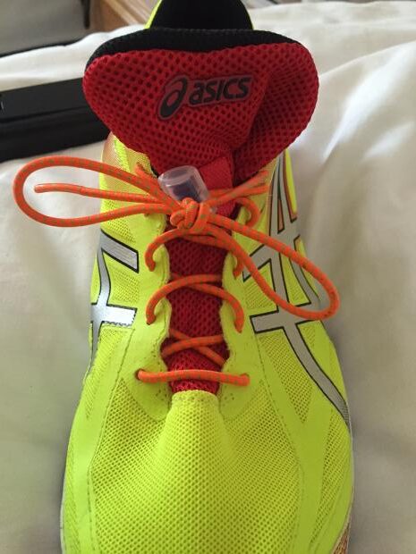 Below are Aaron Royle's new lacing system he's trying out. These are from Asics, and these replace the Xtenex laces he was using. For him, and a number of others, the Xtenex knots in the laces bother him. Xtenex seems to be a very popular lace of choice because it allows the user to custom design shoe tightness up and down the shoe through deciding how many knots span the distance between holes on either side of the eyestay. But if the knots bother you, no can do.
