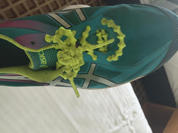 Above are the very orderly shoes of Barbara Riveros. These are Xtenex laces and the unique feature of Xtenex is the elastic, expandable knot that, when pulled tight, straightens (the knot goes away). This allows the shoelace to move through the eyelets or holes when inserting them into the shoe. They stay put at all other times.
