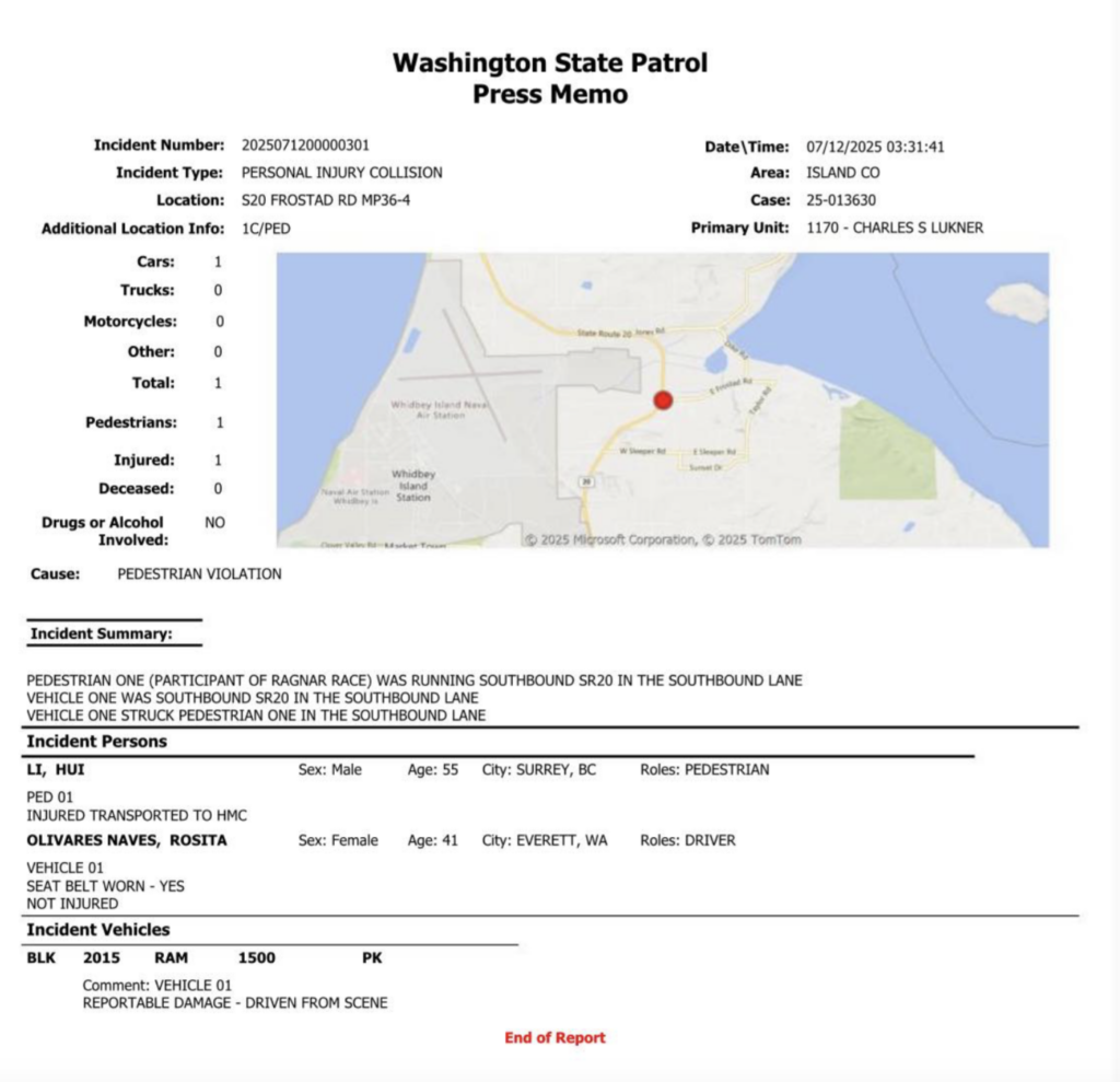 According to documents from the Washington State Patrol, Li was running southbound on State Route 20 in Oak Harbor, Washington at approximately 3:30 AM.