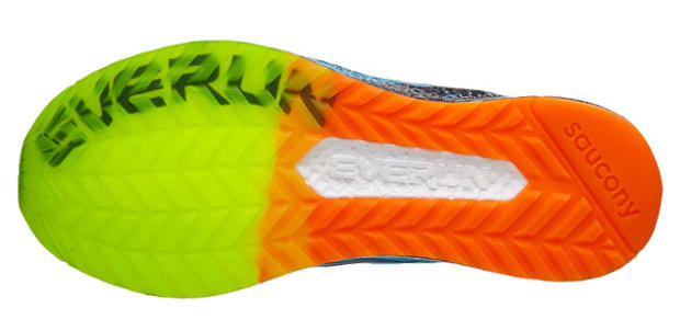 The new sole material is not the only feature of note. In fact, probably unintentionally, Saucony built a near-perfect triathlon shoe for those with a neutral gate. Add heel and and tongue loops and you’re there. As Pearl izumi and Zoot are terminating their triathlon specific models, here is the heir apparent. Any shoe maker can add two loops.